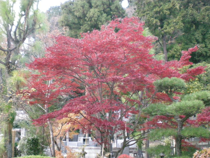 樹齢45年ぐらい。目にはもっともっと鮮やかな赤に見えます。本堂の西側に君臨しています。 この右奥にゆず。手前にドウダンツツジがあります。 本堂と墓地に挟まれた庭は、春の新緑・そして紅葉、楽しみ多い場所です。