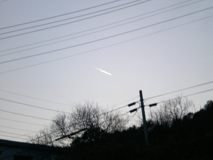 犬の散歩中のスナップです。旅客機が沈みゆく太陽に向かって飛んでいました。飛行機雲がとてもきれいだったので、境内写真ではありませんがご紹介いたします。